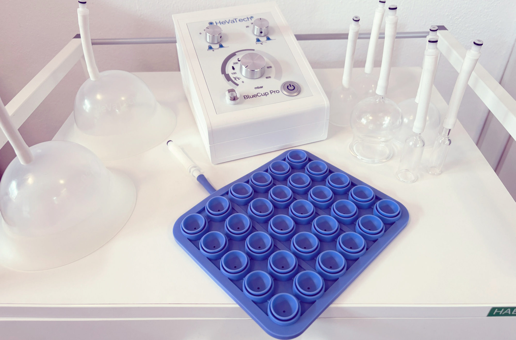Dabei setzte ich in meiner Praxis das BlueCupPro – Gerät der Firma HeVaTech ein. Es ermöglicht eine exakte, individuelle Druckeinstellung. Durch die Pulsation des Gerätes entsteht zusätzlich eine Massage im Vakuum.